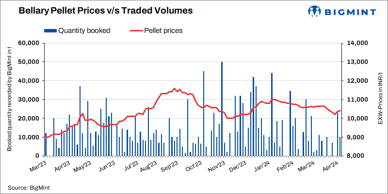 Pellet (Fe 63%) prices in Bellary, Karnataka inched up by INR 50/t to INR 10,400/t exw on 9 Apr’24 compared to 5 Apr. Deals of 10,000 t of pellet booked in the publishing window. Lower trade activities witnessed due to holidays, whereas, rise in sponge prices have supported pellet prices in the region. In addition, sponge (P-DRI) prices increased by INR 750/t w-o-w to INR 27,000/t exw today.