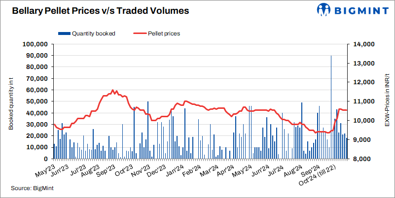 Pellet (Fe63%) prices in Bellary remained stable at INR 10,550/t ($125/t) exw on 22 Oct’24 compared to 18 Oct. Deals of 18,000 t were concluded at INR 10,300-10,600/t ($123-126/t). However, trades may remain slower in the coming days amid weak market sentiments in the steel segments. Sponge PDRI prices decreased by INR 1,300/t ($15/t) w-o-w to INR 26,000/t exw ($309/t).