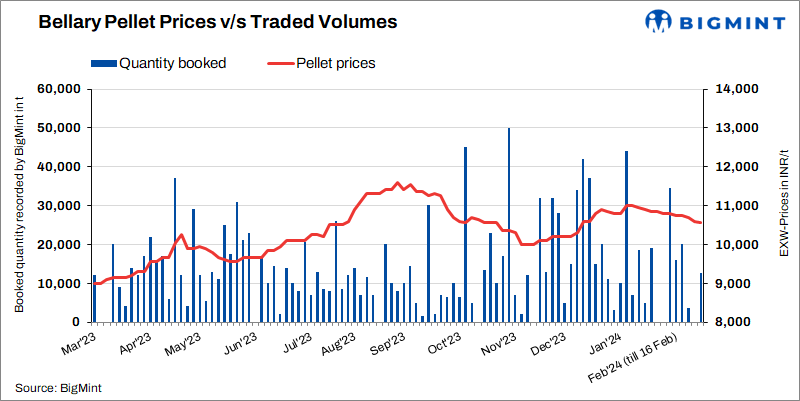 Pellet (Fe 63%) prices in Bellary, Karnataka dropped by INR 50/t to INR 10,550/t exw on 16 Feb’24 compared to 13 Feb. Deals of around 12,500 t were concluded at INR 10,500-10,700/t exw. Lacklustre activities witnessed in the region, mill players have booked material at need basis. Meanwhile, sponge (P-DRI) prices have decreased by INR 100/t w-o-w to INR 26,150/t exw.