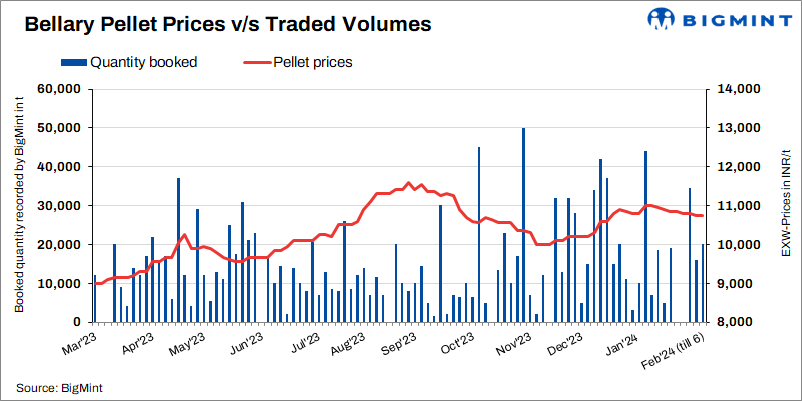 Pellet (Fe 63%) prices in Bellary, Karnataka remained stable at INR 10,750/t exw on 6 Feb’24 compared to 2 Feb. Deals of around 20,000 t were concluded at INR 10,800/t exw. As per sources, a few plants are cutting steel production due to poor market sentiment. Meanwhile, sponge (P-DRI) prices decreased by INR 400/t w-o-w to INR 26,250/t exw.