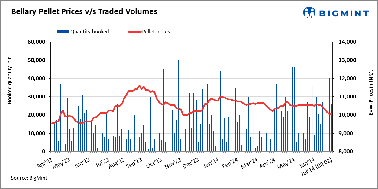Pellet (Fe63%) prices in Bellary, Karnataka remained stable at INR 10,050/t exw on 2 Jul’24 compared to 28 Jun. Around 26,000 t of deals were concluded at INR 10,000-10,200/t. Trading activities were recorded at similar levels keeping pellet prices supported in the region. However, sponge iron (P-DRI) prices rose by INR 600/t w-o-w to INR 26,600/t exw today.