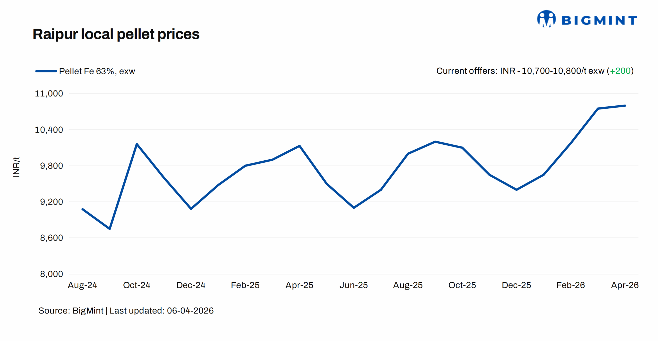 Raipur-based pellet producers raised offers for Fe 62/63% (+/-0.5%) material by INR 200/t ($2-3/t) to INR 10,700-10,800/t ($115-116/t) exw. The increase in pellet prices was followed by a hike of INR 450-550/t ($5-6/t) in iron ore prices by NMDC Chhattisgarh and Lloyds Metals for Apr’26 delivery. Sponge PDRI prices in Raipur increased by INR 1,450/t ($16/t) w-o-w to INR 27,250/t ($293/t) exw, supporting pellet prices.