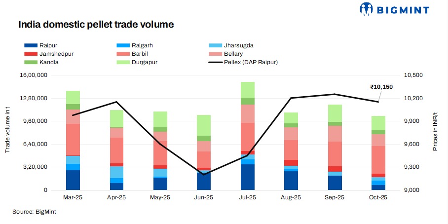According to data, pellet trade volumes fell in all major regions, except Barbil and Kandla, where buyers maintained trading activity. Notably, Raipur saw a sharp 65% drop in trading volume against September, reflecting muted demand from local sponge iron units.