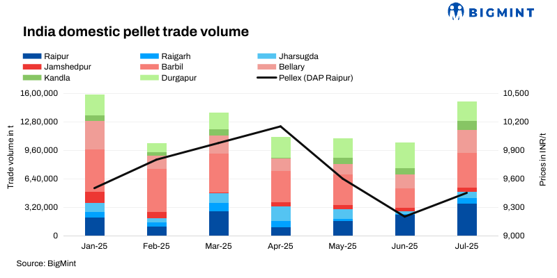 Key regions such as Raipur, Barbil, and Bellary posted a sharp increase in trading activity. Market participants attributed this to buyers preferring pellets, which offer better performance and handling advantages during the monsoon season. A steelmaker informed BigMint, “Due to excessive rainfall, iron ore lump availability and handling were challenging, which made pellets the preferred choice.”