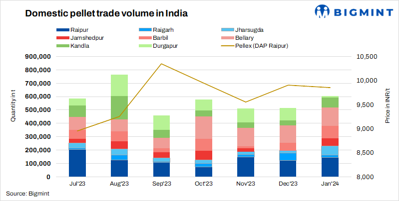 Pellet trade volumes in the domestic market rose by 21% m-o-m to 617,900 tonnes (t) in January 2024 compared to 512,700 t in December 2023, according to data maintained with BigMint.