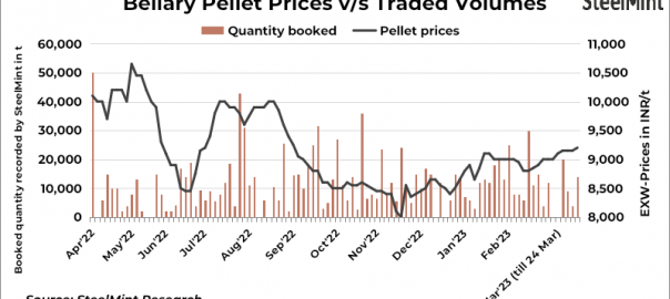 Iron ore pellets (Fe 63%) prices in Bellary, Karnataka, inched up by INR 50/t to INR 9,200/t exw on 24 Mar’23 compared to 21 Mar’23, as per SteelMint’s assessment. Confirmed deals of 14,000 t were recorded in this publishing window at INR 9,200-9,300/t exw. Pellet-based sponge iron, P-DRI, prices fell by INR 250/t w-o-w to INR 29,550/t exw today.