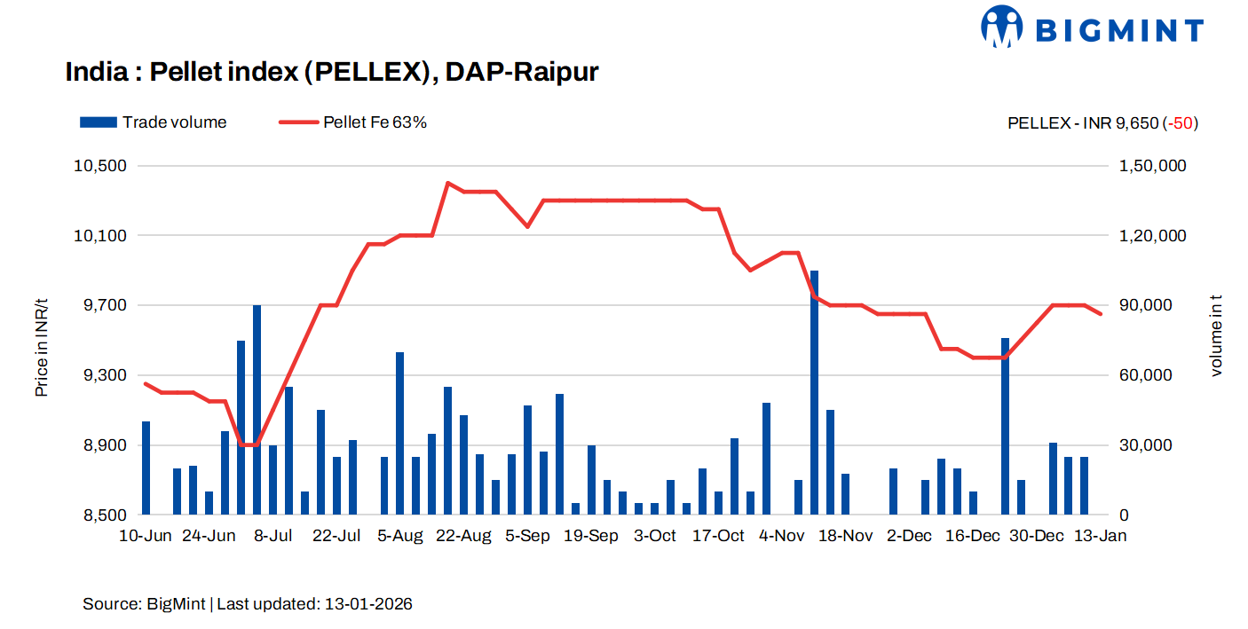 PELLEX, BigMint’s bi-weekly domestic pellet (Fe63%) index for Raipur, fell by INR 50/t to INR 9,650/t ($107/t) DAP on Tuesday compared to the previous assessment on 9 January. No pellet deals were reported in the Raipur region in this publishing window.