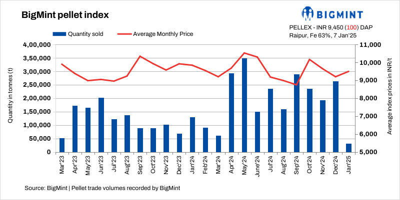 BigMint’s bi-weekly domestic pellet (Fe63%) index dropped by INR 100/t ($1/t) to INR 9,450/t ($110/t) DAP Raipur on 7 January 2025 compared to the previous assessment on 3 January. No deals were reported in Raipur in this publishing window.