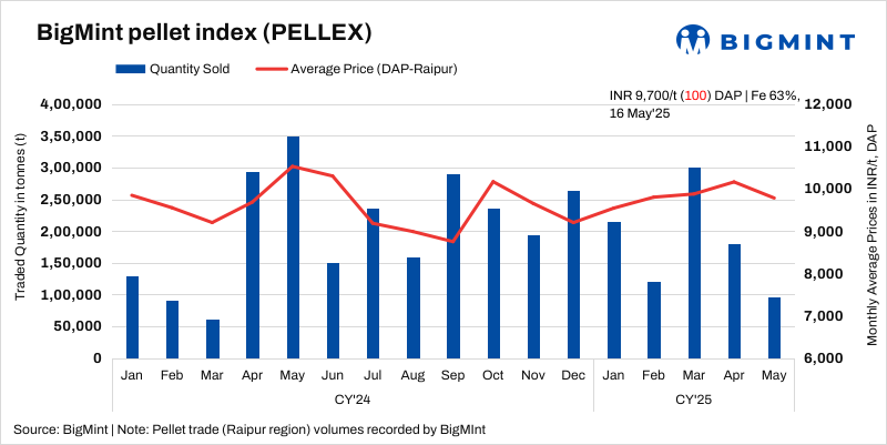 PELLEX, BigMint’s bi-weekly domestic pellet (Fe63%) index for Raipur, dropped by INR 100/tonne (t) ($1/t) to INR 9,700/t ($113/t) DAP Raipur on 16 May compared to the previous assessment on 13 May. Raipur-based pellet producers kept offers for Fe 63% (+/- 0.5%) stable at INR 9,600-9,700/t ($112-113/t) exw. However, deals took place at lower prices, with around 15,000 t heard traded at INR 9,500-9,600/t ($111-112/t) exw.