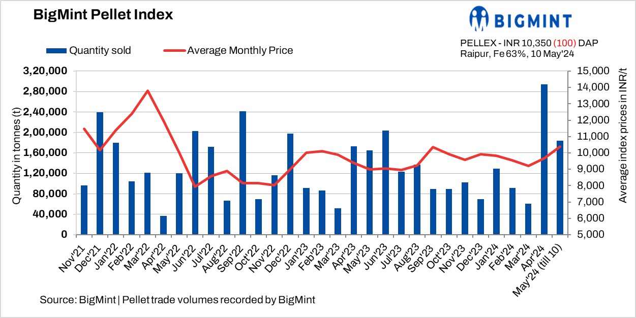 BigMint’s bi-weekly domestic pellet (Fe 63%) index fell by INR 100/t ($1/t) to INR 10,350/t ($124/t) DAP Raipur on 10 May, 2024 compared to the last assessment on 7 May. Raipur steelmakers booked around 35,000 t of pellets (Fe62.5/63%) from the neighbouring regions at INR 9,800-10,100/t DAP Raipur in this publishing window.