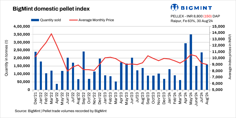 BigMint’s bi-weekly domestic pellet (Fe63%) index dropped by INR 150/t ($2/t) to INR 8,800/t ($105/t) DAP Raipur as of 30 August 2024, compared to 27 August. Around 5,000 t of pellets (Fe63%) were sold by Raipur pellet producers at revised offers of INR 9,000/t ($107/t) DAP Raipur. Additionally, Raipur buyers booked around 20,000 t of pellets (Fe62.5%) from Odisha at INR 8,200-8,300/t ($98-99/t) DAP Raipur a few days back.