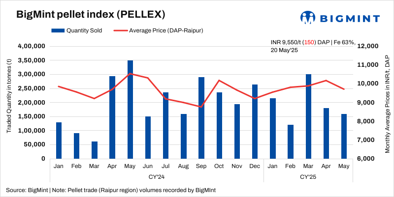 As per BigMint’s analysis, pellet prices in central India are likely to remain under pressure in the near term. Market participants expect need-based buying to continue as steelmakers remain cautious amid market uncertainties and subdued end-user demand.