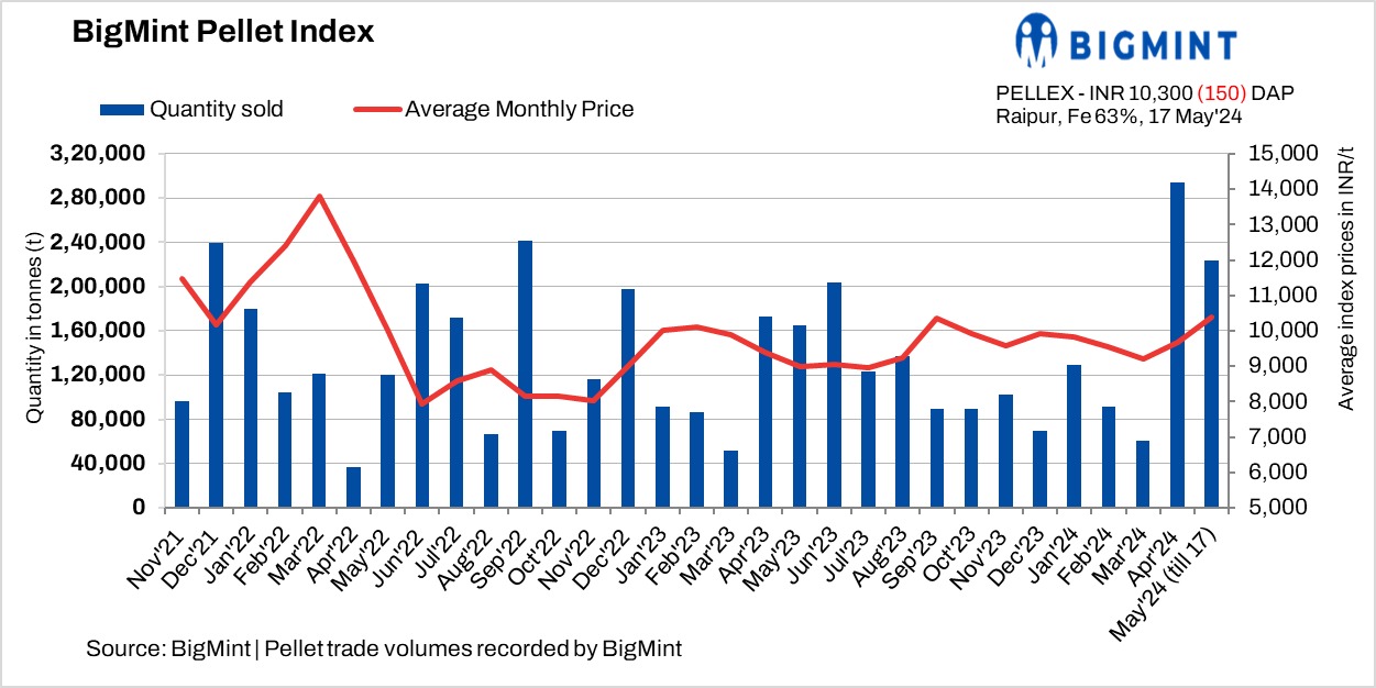 BigMint’s bi-weekly domestic pellet (Fe 63%) index fell by INR 150/tonnes (t) ($2/t) to INR 10,300/t ($123/t) DAP Raipur on 17 May,2024 compared to the last assessment on 14 May. Raipur sponge and steelmakers booked around 10,000 t of pellets (Fe 62.5+/-0.5%) at around INR 10,000/t DAP Raipur in this publishing window.