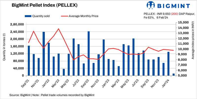 BigMint’s bi-weekly domestic pellet (Fe 63%) index fell by INR 200/t to INR 9,650/t DAP ($115/t) Raipur on 6 February 2024 compared to the last assessment on 2 February 2024. No deal was recorded in this publishing window in absence of active trade activities.