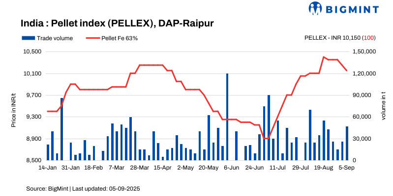 PELLEX, BigMint’s bi-weekly domestic pellet (Fe63%) index for Raipur, decreased by INR 100/tonne (t) to INR 10,150/t ($115/t) DAP on 5 September 2025 compared to the previous assessment on 2 September. Around 47,000 t of deals were recorded in the Raipur market at revised offers from local suppliers.