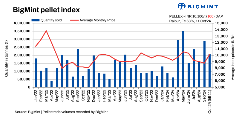 BigMint’s bi-weekly domestic pellet (Fe63%) index fell by INR 100/t ($1/t) to INR 10,100/t ($120/t) DAP Raipur on 11 October 2024 compared to the previous assessment on 8 October. During this publishing window, Raipur-based pellet producer sold around 5,000 t of pellets (Fe63%) at INR 10,100/t ($120/t) exw. Additionally, Odisha-based sellers concluded deals of around 10,000 t of pellets (Fe62.5%) at INR 9,700/t ($115/t) DAP Raipur.