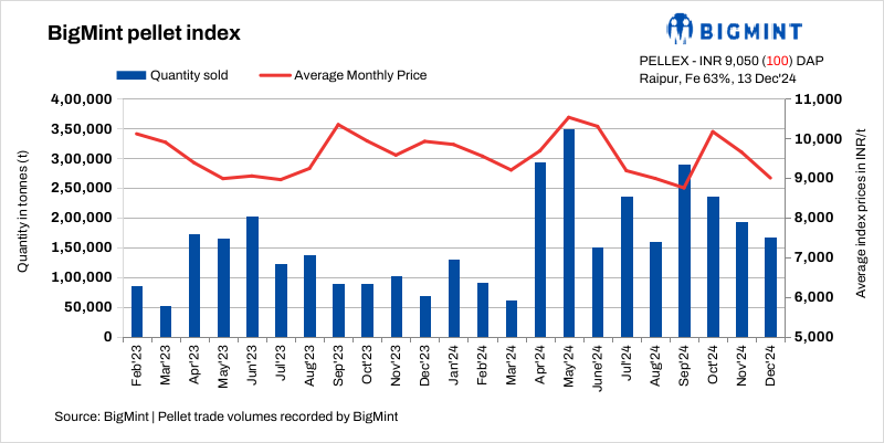 BigMint’s bi-weekly domestic pellet (Fe63%) index decreased by INR 100/t ($1/t) to INR 9,050/t ($107/t) DAP Raipur on 13 December compared to the previous assessment on 10 December. A buyer booked 5,000 t of pellets at INR 8,950/t DAP Raipur from local pellet producers.