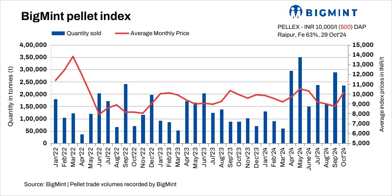 BigMint’s bi-weekly domestic pellet (Fe63%) index fell by INR 500/t ($6/t) to INR 10,000/t ($119/t) DAP Raipur on 29 October compared to the previous assessment on 25 October. Raipur-based sellers concluded a 5,000-10,000 t pellet deal at INR 9,800-9,900/t ($117-118/t) exw at lowered offers in this publishing window.