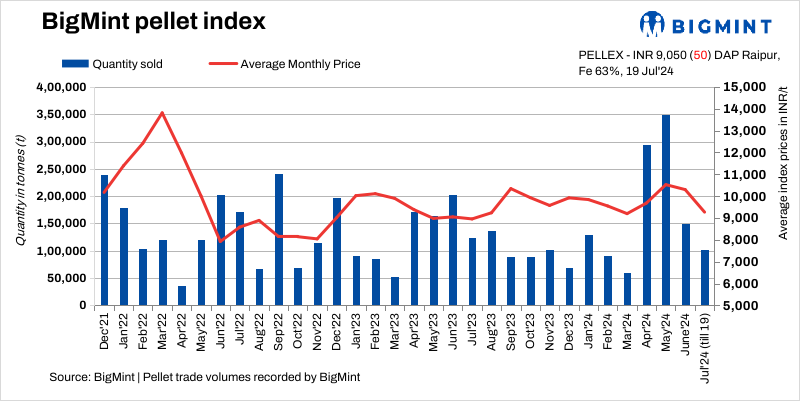 BigMint’s bi-weekly domestic pellet (Fe63%) index fell by INR 50/tonne (t) to INR 9,050/t ($109/t) DAP Raipur on 19 July, 2024 compared to the last assessment on 16 July. PELLEX dropped to a year’s low. The last time such levels were seen in the first half of August 2023, as per data maintained with BigMint.