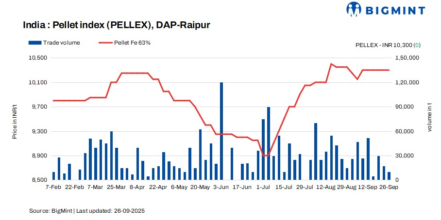 PELLEX, BigMint’s bi-weekly domestic pellet (Fe63%) index for Raipur, remained stable at INR 10,300/t ($116/t) DAP on 26 September 2025 compared to the previous assessment on 22 September. Deals for around 10,000 t were recorded in the Raipur market in the last couple of days, concluded by local pellet suppliers.