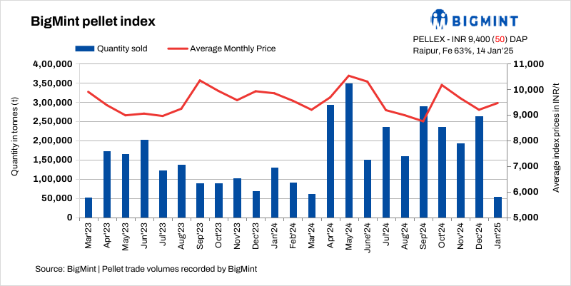BigMint’s bi-weekly domestic pellet (Fe63%) index inched down by INR 50/t to INR 9,400/t ($109/t) DAP Raipur on 14 January 2025 compared to the previous assessment on 10 January. Raipur-based steelmakers concluded around 22,000 t of pellet (Fe63%) deals at INR 9,150-9,650/t ($106-111/t) DAP from local producers.