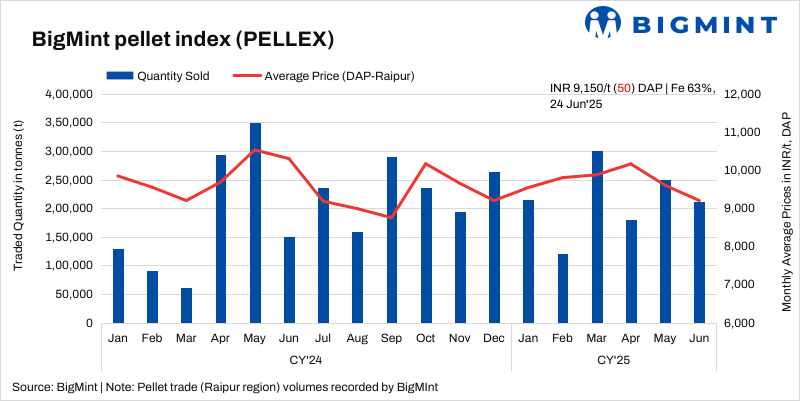 No major trade activity was witnessed in Raipur in this publishing window. Only 10,000 t of pellets were sold by the Raipur-based pellet producer. Some trades were heard conducted to meet immediate requirements, although confirmation is till awaited.