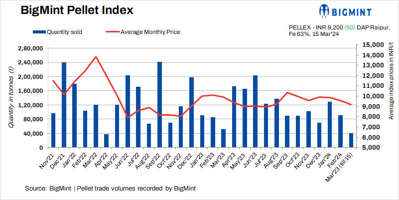 BigMint’s bi-weekly domestic pellet (Fe 63%) index inched up by INR 50/t to INR 9,200/t DAP ($109/t) Raipur on 15 March 2024 compared to the last assessment on 12 March. No deals were recorded in this publishing window due to a slow market activity coupled with downtrend pellet export market.