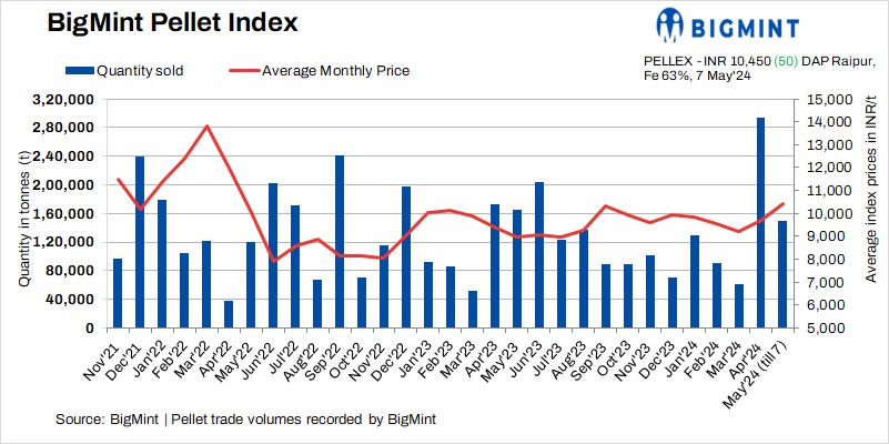 BigMint’s bi-weekly domestic pellet (Fe 63%) index increased by INR 50/t ($1/t) to INR 10,450/t ($124/t) DAP Raipur on 7 May, 2024 compared to the last assessment on 3 May. The index increased following the hike in pellet prices by Raipur-based producers. In the last 10 days Raipur pellet prices have been increased by around INR 700-800/t.