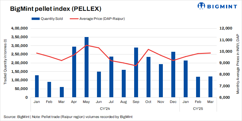 BigMint’s bi-weekly domestic pellet (Fe63%) index remained unchanged at INR 9,850/t ($113/t) DAP Raipur on 18 March 2025 compared to the previous assessment on 11 March. In this publishing window, around 30,000 t of pellets (Fe62/63%) deals were concluded by Raipur based steelmaker at INR 9,750-9,950/t DAP Raipur. A deal of around 15,000 t of higher grade pellets (Fe65%) was also concluded in the Raipur region.
