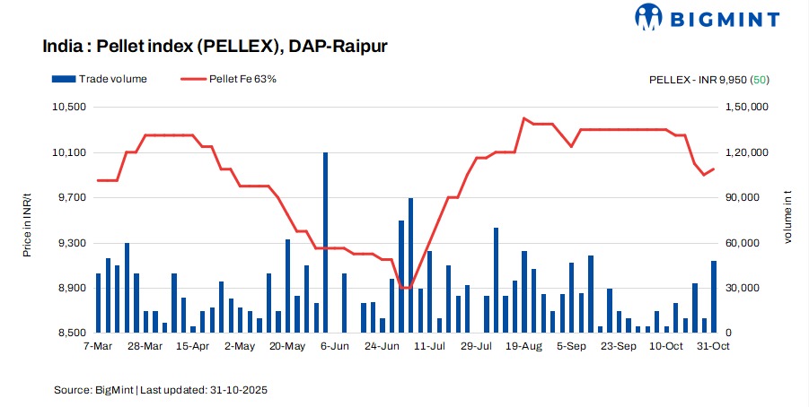 PELLEX, BigMint’s bi-weekly domestic pellet (Fe63%) index for Raipur, rose by INR 50/t to INR 9,950/t ($113/t) DAP on 31 October 2025 compared to the previous assessment on 28 October. Around 48,000 t pellet deals were concluded in Raipur at INR 9,800-10,200/t DAP concluded by local and Odisha-based producers.