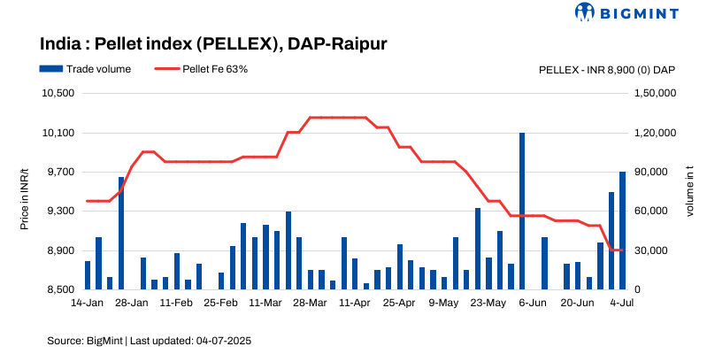 PELLEX, BigMint’s bi-weekly domestic pellet (Fe63%) index for Raipur, remained stable at INR 8,900/t ($104/t) DAP Raipur on 4 July compared to the previous assessment on 1 July.