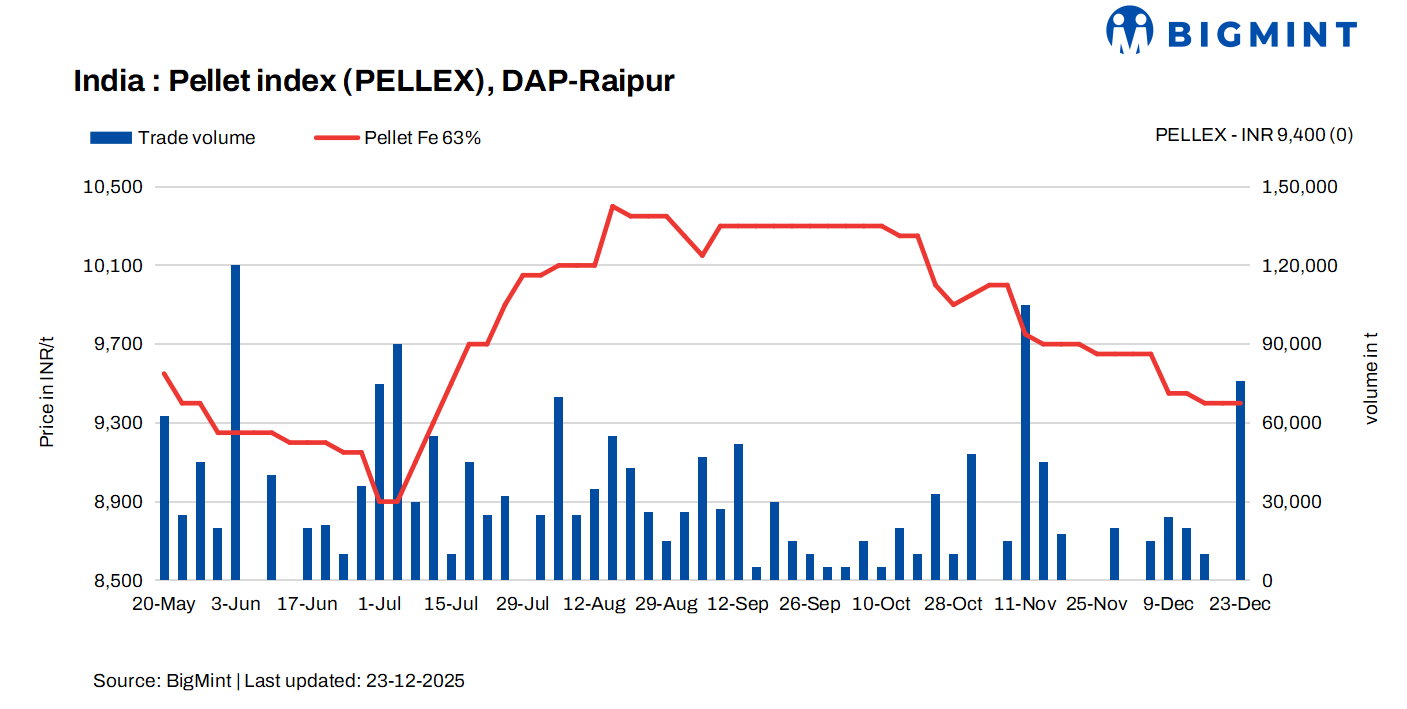 PELLEX, BigMint’s bi-weekly domestic pellet (Fe63%) index for Raipur, remained stable at INR 9,400/t ($105/t) DAP on Tuesday compared to the previous assessment on 19 December. Deals for around 75,000 t of pellets were concluded by Raipur-based sellers at INR 9,200-9,400/t ($103-105/t) exw.