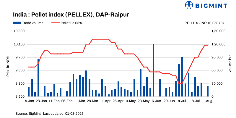 PELLEX, BigMint’s bi-weekly domestic pellet (Fe63%) index for Raipur, remained stable at INR 10,050/t ($115/t) DAP on 1 August 2025 compared to the previous assessment on 29 July.
