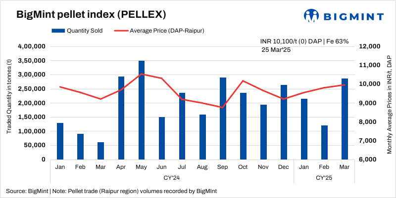 BigMint’s bi-weekly domestic pellet (Fe63%) index remained stable at INR 10,100/t ($118/t) DAP Raipur on 25 March 2025 compared to the previous assessment on 21 March. In this publishing window, around 30,000 t of pellets (Fe63%) deals were concluded by Raipur-based producers at INR 9,850-10,200/t ($115-119/t) DAP Raipur from local suppliers. Meanwhile, around 10,000 t of Fe 62.5/63% material was booked at INR 9,400-9,700/t ($110-113/t) DAP Raipur a few days back from Odisha-based suppliers.
