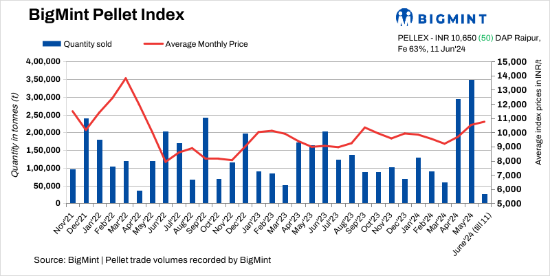 BigMint’s bi-weekly domestic pellet (Fe63%) index remained largely stable at INR 10,650/t ($128/t) DAP Raipur on 11 June, 2024 compared to the last assessment on 7 June. No active deals were recorded in Raipur due to weak market sentiments. Buyers remained cautious about purchasing pellets amid decent inventory levels.