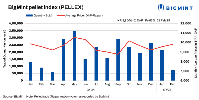 BigMint’s bi-weekly domestic pellet (Fe63%) index remained stable at INR 9,800/t ($113/t) DAP Raipur on 21 February 2025 compared to the previous assessment on 18 February. BigMint recorded no pellet deal in this publishing window amid uncertain market sentiments.