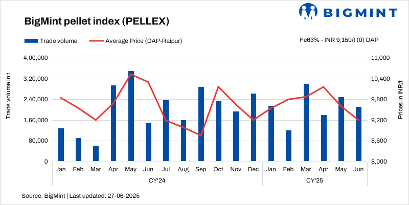 PELLEX, BigMint’s bi-weekly domestic pellet (Fe63%) index for Raipur, remained stable at INR 9,150/t ($107/t) DAP Raipur on 27 June compared to the previous assessment on 24 June. Raipur-based pellet producers kept their offers for Fe 62/63% (+/_0.5%) material stable at INR 9,000-9,100/t ($105-106/t) exw.