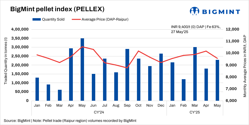 PELLEX, BigMint’s bi-weekly domestic pellet (Fe63%) index for Raipur, remained stable at INR 9,400/t ($110/t) DAP Raipur on 27 May compared to the previous assessment on 23 May.