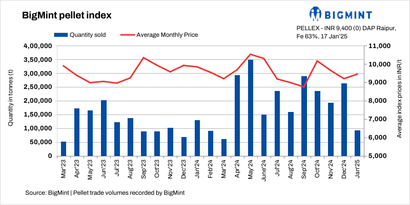 BigMint’s bi-weekly domestic pellet (Fe63%) index remained stable at INR 9,400/t ($109/t) DAP Raipur on 17 January 2025 compared to the previous assessment on 14 January. Raipur-based steelmakers concluded around 40,000 t of pellet (Fe63%) deals at INR 9,450-9,650/t ($106-111/t) DAP from local producers.
