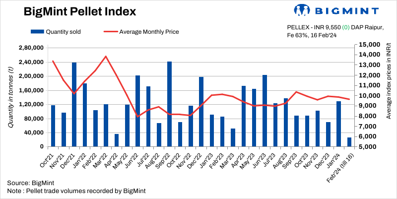 BigMint’s bi-weekly domestic pellet (Fe 63%) index remained stable at INR 9,550/t DAP ($115/t) Raipur on 16 February 2024 compared to the last assessment on 13 February. A deal of 15,000 t was recorded at INR 9,550/t DAP Raipur in this publishing window. Landed offers from Odisha were lowered by INR 200-400/t than local Raipur offers, sources informed.