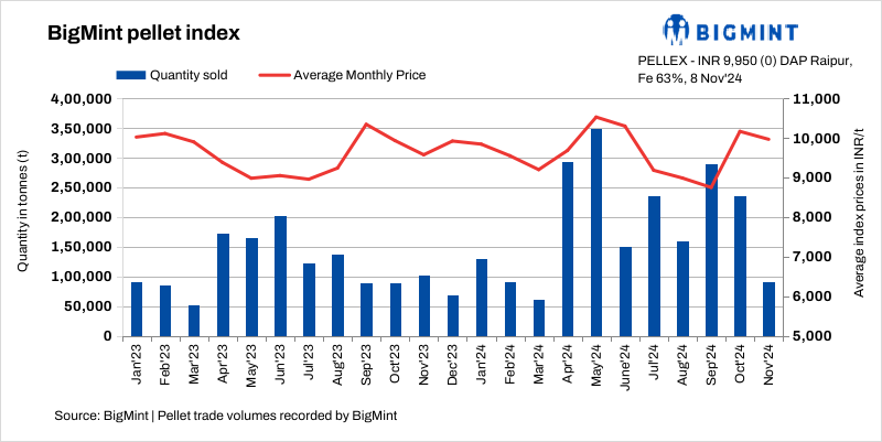 BigMint’s bi-weekly domestic pellet (Fe63%) index remained stable at INR 9,950/t ($118/t) DAP Raipur on 8 November compared to the previous assessment on 5 November. Steelmakers actively purchased raw pellets in the last couple of days from local and Odisha-based producers, amid positive downstream steel market sentiments. Deals of around 22,000 t (Fe63-63.5%) were concluded by Raipur producers at INR 9,950-10,550/t ($116-123/t) DAP, in this publishing window. Odisha-based pellet producers sold around 32,500 t of raw pellets (Fe62.5-63%) at INR 9,350-10,000/t ($111-119/t)DAP Raipur in this publishing window.