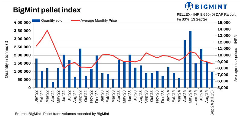 - Pellet offers remain stable: Raipur-based pellet makers kept their offers for Fe 63% (+/- 0.5%) stable at INR 8,600/t ($102/t) exw-Raipur as of 13 September. A seller concluded transactions at these prices recently.