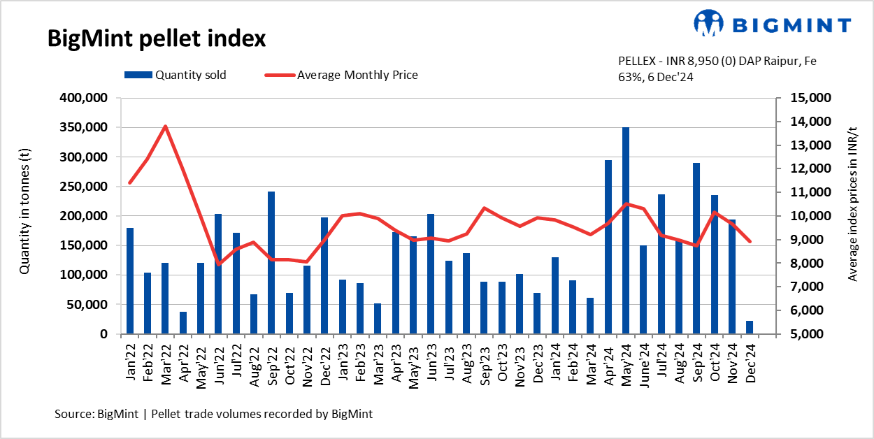 BigMint’s bi-weekly domestic pellet (Fe63%) index remained stable at INR 8,950/t ($105/t) DAP Raipur on 6 December compared to the previous assessment on 3 December. Around 22,000 t of pellet (Fe63%) deals were concluded by Raipur producers at revised offers of INR 8,700-8,800/t ($103-104/t) exw over the last couple of days.