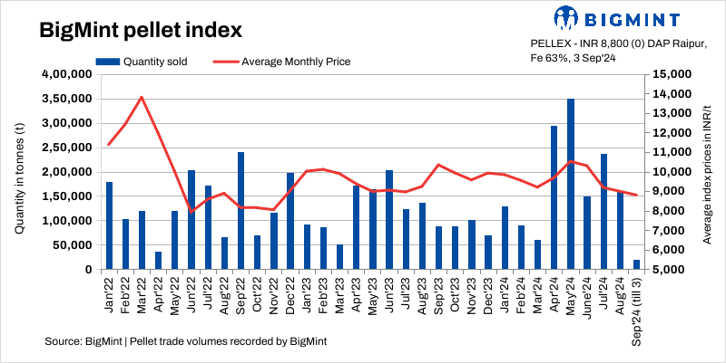BigMint’s bi-weekly domestic pellet (Fe63%) index remained stable at INR 8,800/t ($105/t) DAP Raipur as on 3 September 2024, compared to 30 August. Around 10,000 t of pellets (Fe63%) were sold by pellet producers at INR 9,050/t ($108/t) DAP Raipur. Additionally, Raipur buyers booked around 10,000 t of pellets (Fe62.5%) from Odisha at INR 8,300-8,400/t ($99-100/t) DAP a few days back.