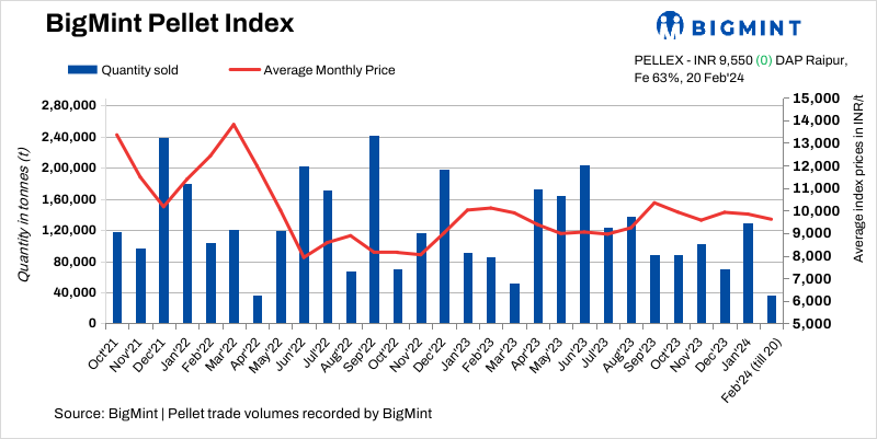 BigMint’s bi-weekly domestic pellet (Fe 63%) index remained stable at INR 9,550/t DAP ($115/t) Raipur on 20 February 2024 compared to the last assessment on 16 February. A deal of 10,000 t was recorded at INR 9,550/t DAP Raipur in this publishing window. Buyers remained cautious about booking fresh material in the expectation of a price reduction by local plants. However, one major plant from Raipur increased offers by INR 200/t to INR 9,600-9,700/t exw recently.