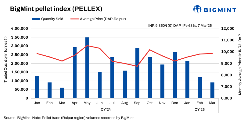 BigMint’s bi-weekly domestic pellet (Fe63%) index remained stable at INR 9,850/t ($113/t) DAP Raipur on 7 March 2025 compared to the previous assessment on 4 March. In this publishing window, around 20,000 t of pellet (Fe62%) deals were concluded at INR 9,750 ($112/t) DAP Raipur. At the same time, around 20,000 t of pellet (Fe65%) were also got booked at INR 11,100/t ($128/t) exw-Raipur.