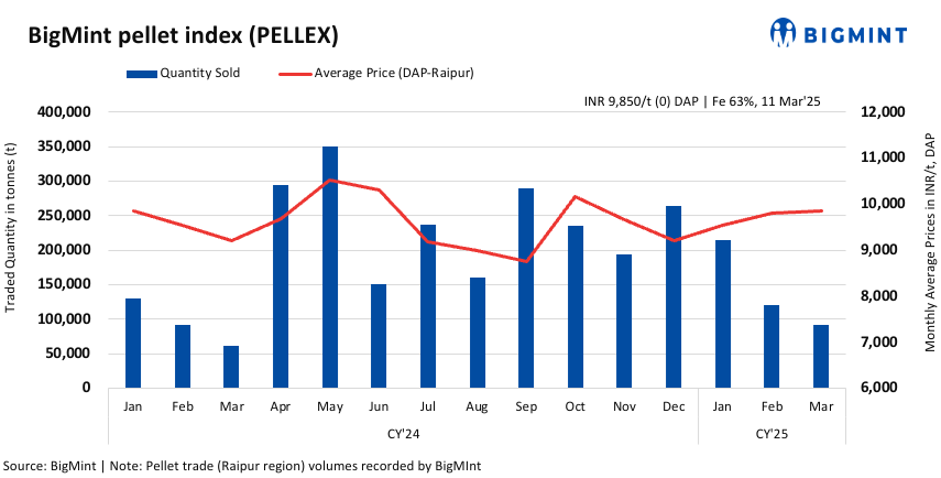BigMint’s bi-weekly domestic pellet (Fe63%) index remained stable at INR 9,850/t ($113/t) DAP Raipur on 11 March 2025 compared to the previous assessment on 7 March. In this publishing window, around 35,000 t pellets (Fe62/63%) deals were concluded by Raipur based steelmaker at INR 9,600-9,800/t exw Raipur. Around 10,000 t higher grade pellet (Fe65%) also concluded in the Raipur region.