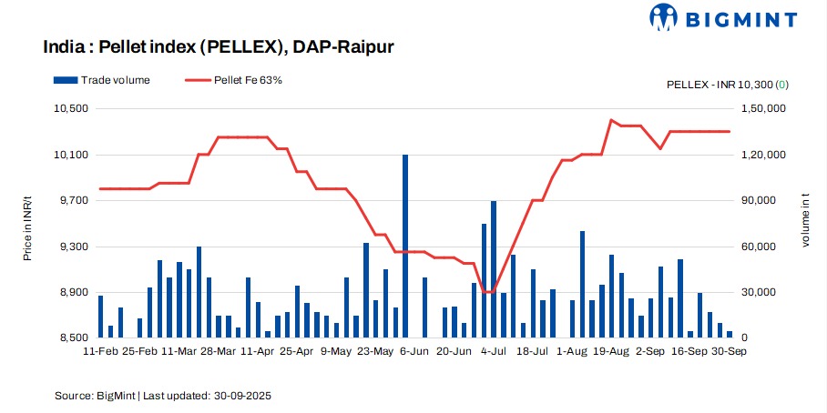 PELLEX, BigMint’s bi-weekly domestic pellet (Fe63%) index for Raipur, remained stable at INR 10,300/t ($116/t) DAP on 30 September 2025 compared to the previous assessment on 26 September. Deals for around 5,000 t were recorded in the Raipur market in the last couple of days.