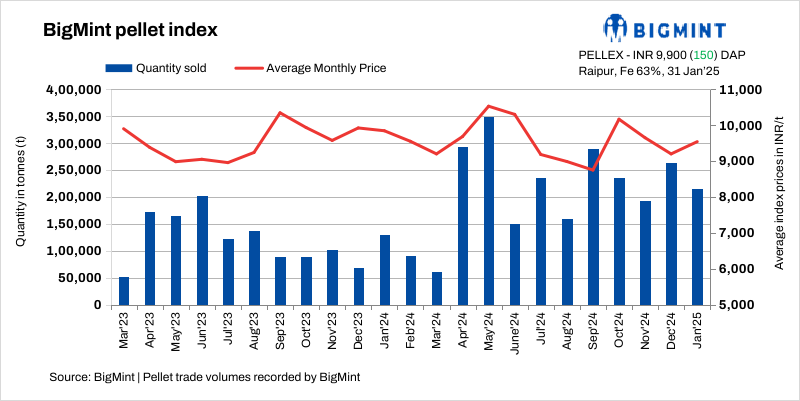 BigMint’s bi-weekly domestic pellet (Fe63%) index increased by INR 150/tonne (t) ($2/t) to INR 9,900/t ($115/t) DAP Raipur on 31 January 2025 compared to the previous assessment on 28 January. Deals for around 25,000 t of raw pellets were recorded at INR 9,650-9,950/t DAP Raipur over the past couple of days at the previous offers.