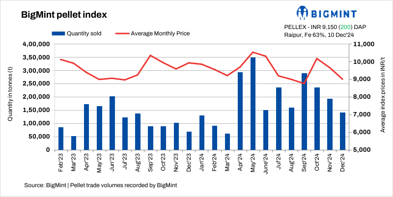 BigMint’s bi-weekly domestic pellet (Fe63%) index increased by INR 200/t ($2.5/t) to INR 9,150/t ($108/t) DAP Raipur on 10 December compared to the previous assessment on 6 December. A Raipur-based producer concluded deals for 75,000 t of pellets (Fe63.5%) at revised offers of INR 9,300/t ($110/t) exw and 45,000 t of higher-grade material (Fe65%) at INR 10,500/t ($124/t) exw. Another sold 40,000 t of raw pellets at INR 9,000/t ($107/t) exw-Durg to buyers based outside of Raipur at revised offers.